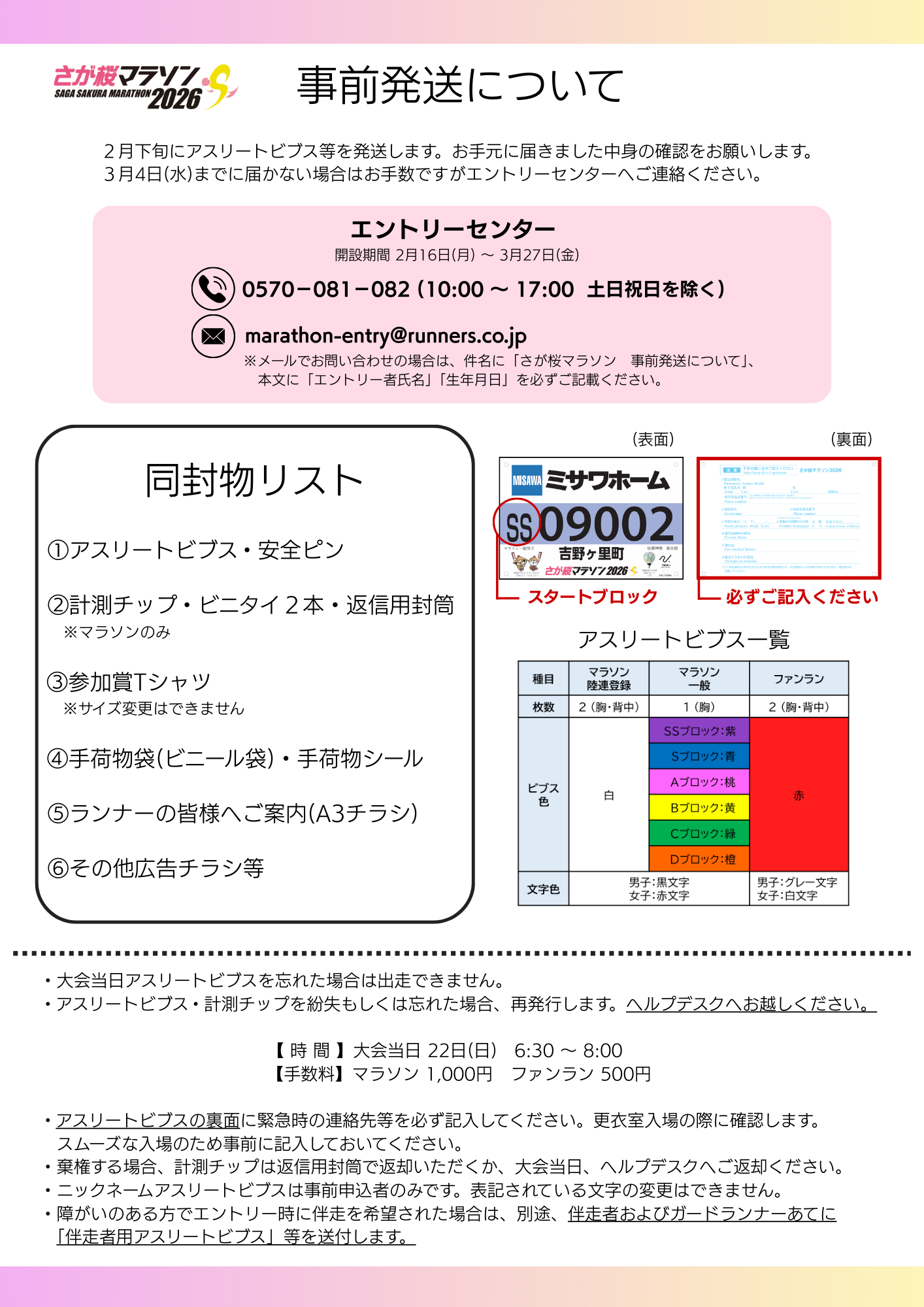 ※メールでお問い合わせの場合は、件名に「さが桜マラソン 事前発送について」、