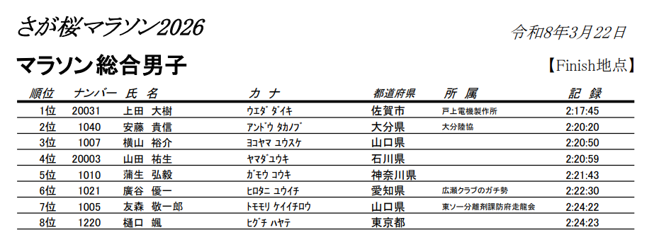 上位入賞者速報(男子)をお知らせいたします。